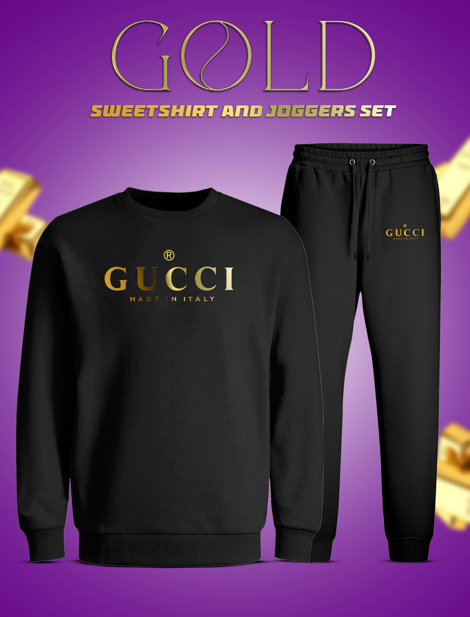 Category: Sweetshirt Color : Black Brand name: Gucci Pattern: China imported fabric .( Philips cotton ) Super Premium ,Soft and very comfortable to wear <3 Size measurement : S:Chest-38'' Length 27" M: Chest-40” Length- 28” L: Chest-42” Length- 29” XL: Chest-44” Length- 30" XXL: Chest-46” Length- 31" Category: Joggers Color: Black Fabric: Premium Philips cotton 💠Size Measurements: M: Waist - 30”-32'' L= Waist: 32''-34 XL= Waist: 34''-36'' XXL= Waist: 36''-38''
