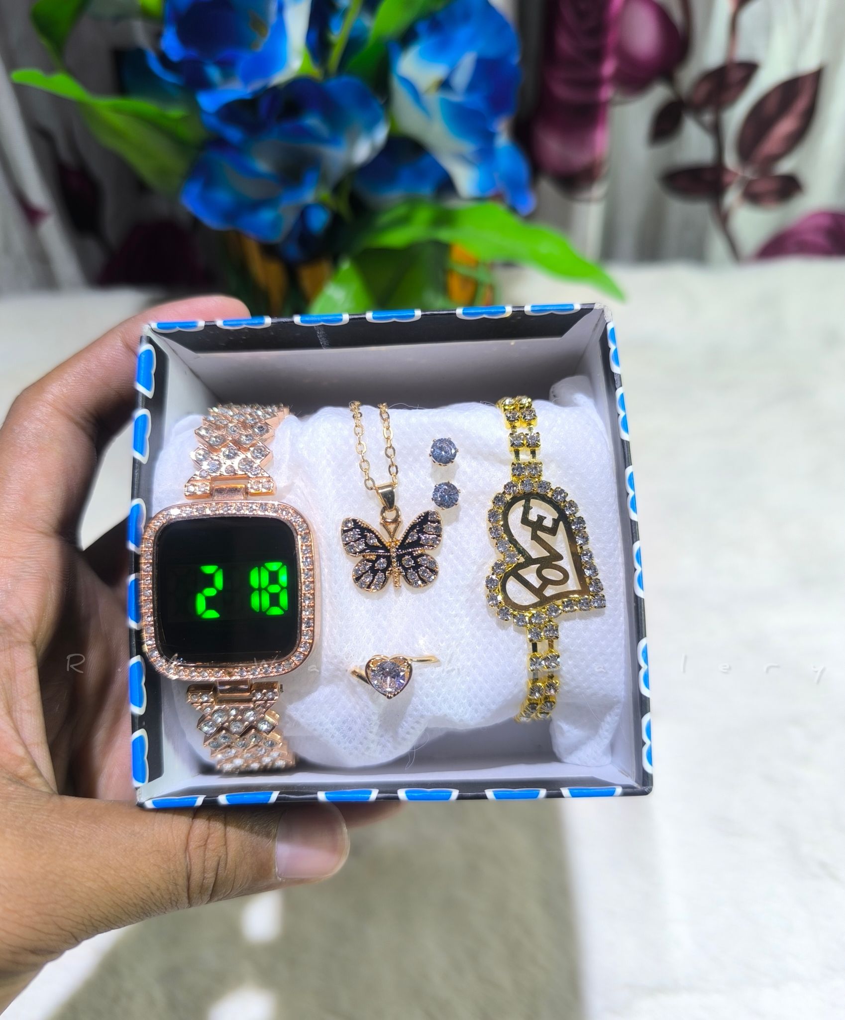 🕒 ১. স্টাইলিশ ডায়মন্ড স্টন ঘড়ি 🦋 ২. Butterfly নেকলেস 💍 ৩. প্রিমিয়াম ডায়মন্ড কাট রিং 🥰৪. Love Stone Bracelet 👂 ৫. এক জোড়া কানের টপ ❤️৬. Love Card. 🎁 ৭. লাক্সারি গিফট বক্স ফ্রী!